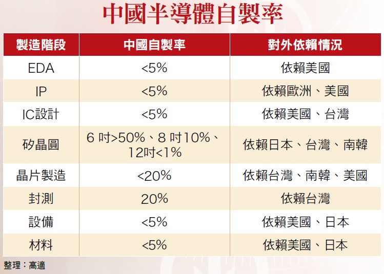目前中國軟體EDA的自製率低於五%,矽智財(IP)低於五%,IC設計低於五%,矽晶圓不一(六吋大於五○%、八吋約十%、一二吋小於一%),晶片製造小於二○%、封測二○%、設備小於五%、材料小於五%。其中,仰賴美國較深的有EDA、IP、IC設計、設備、材料。