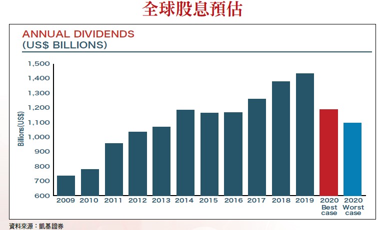 根據資產管理公司Janus Henderson預估,今年全球大型上市公司支付股息的規模將減少十七%至二三%,總金額降至一.一八兆美元至一.一兆美元,相較去年最多恐將縮水四千億美元。