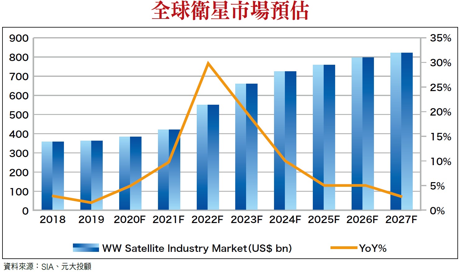 根據SIA(美國半導體產業協會)所發布市調報告預估,全球衛星市場規模將於二○二二年成長達約五五○○億美元,二○二七年,將持續成長達八二○○億美元左右。