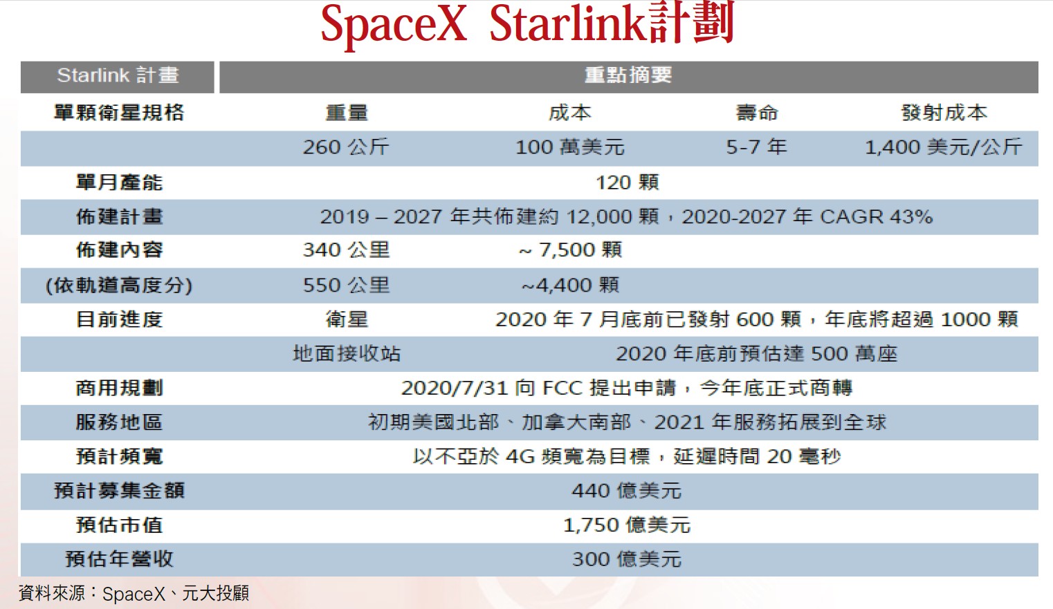 截至今年七月底,SpaceX目前 已發射達六○○顆低地球軌道無線通訊衛星升空,計劃於二○二七年底,總計將發射多達一二○○○顆低軌道無線通訊衛星升空。同時,也預計於美國境內,為最多可達五○○萬戶家庭提供無線通訊連網服務,基本使用費用為每個月八○美元,每月連網速度為一○Mbps。