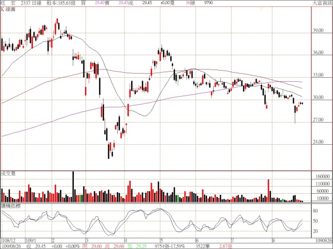 旺宏股價二月時一度達40.9元,五月高點也有37.4元,之後連續四個月震盪走低,八月二十日一度跌到26.8元,八月二十六日收盤29.45元,本益比9.8倍,股價嚴重低估。每年七至十月是當年營運高峰期,這段期間都會有多頭行情表現,目前股價在近五個月低點,最近外資連續買進五天達6621張。