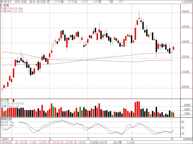 臻鼎-KY股價已連續三個月箱型整理120~140元間,似乎就在等待蘋果新的訂單下達,備料消息傳出後外資連買兩天1572張,9/2收盤127.5元漲4元,本益比10倍,具投資價值。目前年線支撐124元、半年線支撐119元,幾乎在相同位置,有機會成為強而有力底部,未來只要月線132元站上,新的多頭會全面展開。