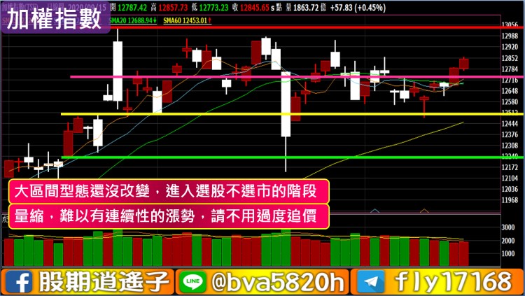 雖然大盤重新站上月線,不過尚未化解月線下彎的壓力,加上量能沒有跟著放大,加權指數仍維持區間震盪,選股不選市的階段,這階段,我們要好好跟著資金流向調整,因為量縮,盤開始有點黏,漲勢集中化在資金流入的個股!