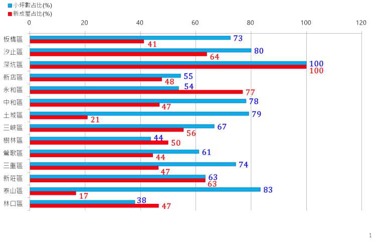 30坪以下小坪數占比55%,新成屋占比48%,並且還有2013年完工建案仍持續銷售中,由此顯見餘屋數量將近一半,導致新建案規劃坪數普遍較小。
