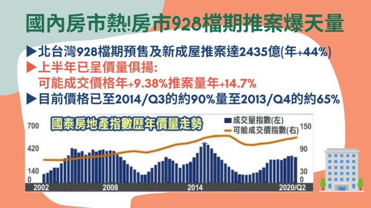 我們注意到,在國際熱錢氾濫及台幣走勢偏多之下,國內房地產確實出現回溫的走勢,以台灣房地產指標的國泰房地產指數來說,目前價量均回復到二○一三至二○一四年高峰不遠的位置,這也表示在經過六年修正過後的房地產市場,開始出現轉強的契機!也很有機會是資金面開始注意到相對位置低檔的資產或營建需求題材。