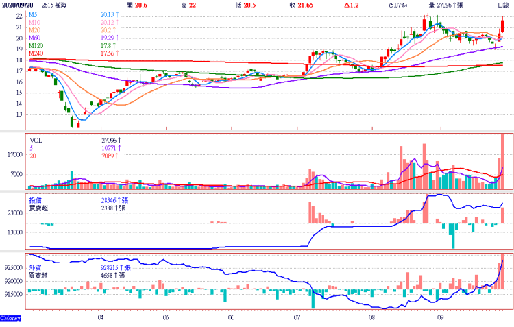 萬海(2615):受惠美國線的運價狂飆,萬海六月底增開美西線衝高營收,帶動八月營收來到六五.二三億元,月增七.三五%。