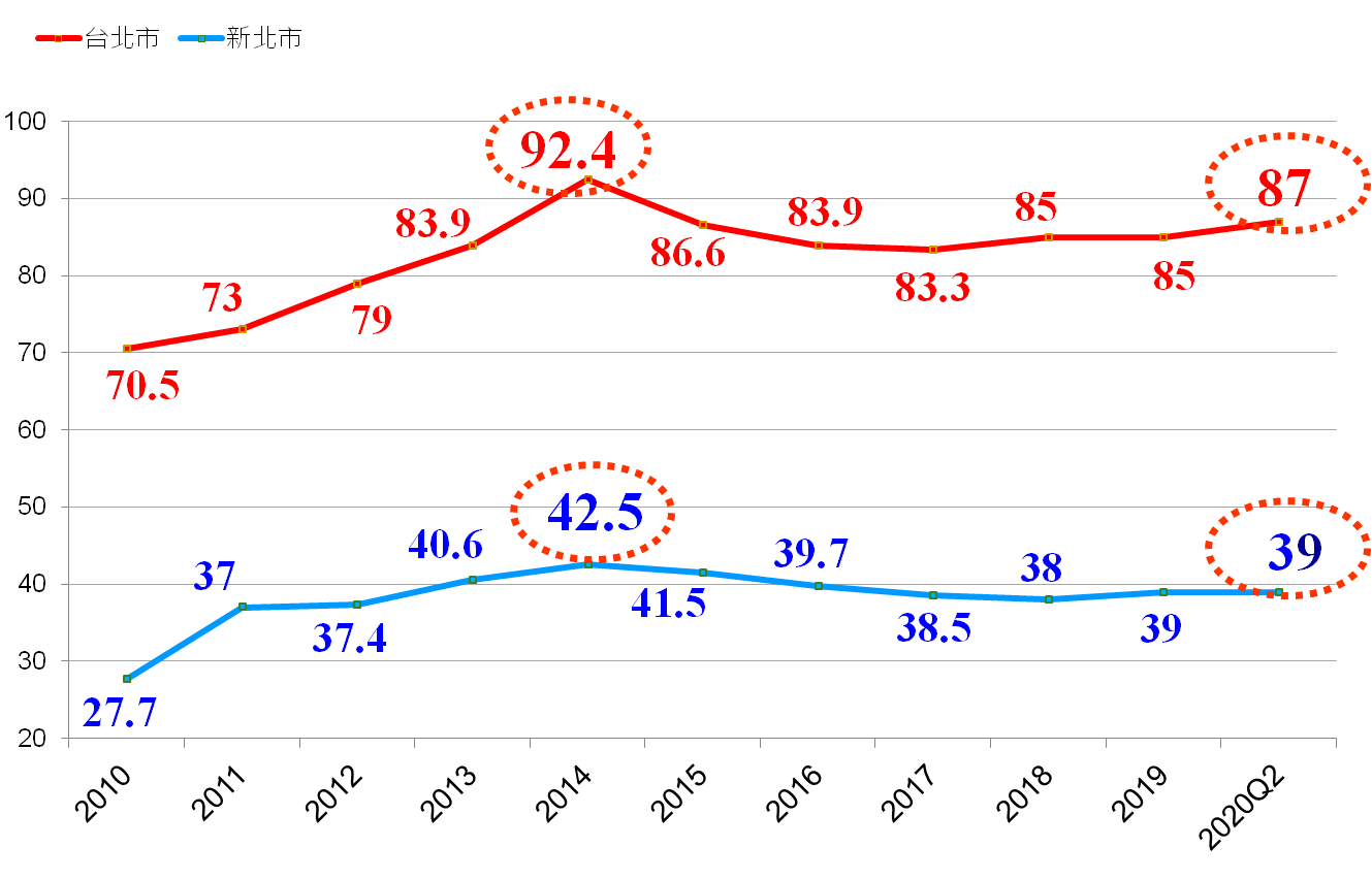此一議題如再追溯往昔數據,台北市自一九七三年第一波房價大幅飆漲起始每坪1.9萬元,至2020Q2每坪87萬元,47年間房價上漲了45.79倍,每年上漲將近一倍,其間雖有起落,不過大致都呈現「大漲小回」趨勢;此外,如再就台北市2014年房價高達每坪92.4萬元,其後因台北市率先祭出囤房稅,房價逐漸下跌至2019年的每坪84.4萬元,跌幅僅8.6%,然在2018年台商逐漸回流情勢下,2020Q2又再攀升至每坪87萬元,再度出現3.08%漲幅。其所以致此,很明顯的就是2014年政府開始打房,房價開始下跌,惟2016年之後投資客再度默不作聲的陸續進場,整體市場購屋遂由自住、換屋再轉向由投資置產所主導。