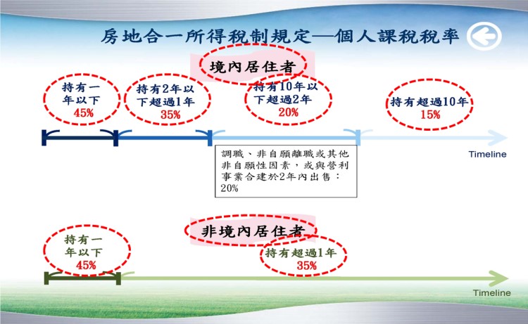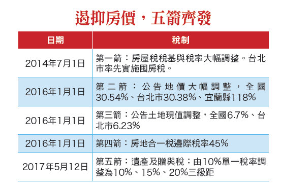 這一波的房市景氣自二○一四年七月一日台北市率先實施囤房稅之後,緊接著二○一六年又陸續大幅調整公告地價與公告土地現值,大幅增加持有成本,並且推出邊際稅率高達45%的房地合一稅(詳請參閱附圖),及至二○一七年,又再將遺產及贈與稅由10%單一稅率調整為10%、15%、20%三級距,一般咸認在大幅提高稅負情況下,房價應該可以獲得控制。