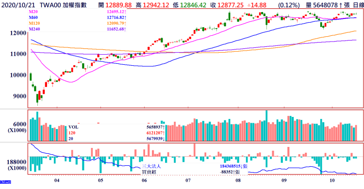 目前就是抓住大原則,只要在12700點關鍵支撐未正式跌破前,短期就是在高檔震盪,來反映第三季財報和十月營收利多、個股表現空間格局。萬一跌破12700點中期支撐,則小心季線將走平下彎,如此整理時間將拉長,進入大區間震盪或至少回測半年線至年線上下。所以現階段操作建議仍是在選股,以及資金的控管。萬一美國大選前後有殺一波下來的話,你才有錢在低檔承接績優電子股,和具實質開發利多的營建資產股。