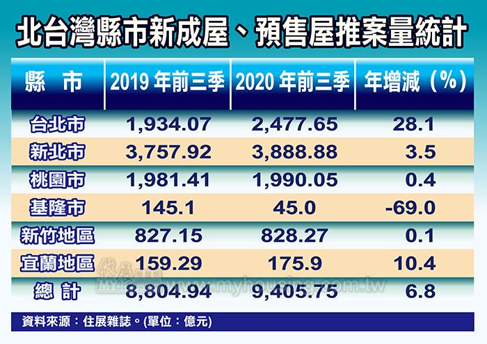 而《住展雜誌》統計,二○二○年第三季,北台灣新成屋、預售屋推案量來到三三二○億元,比去年同期的三千五百多億元減約百餘億元,但今年前三季累計推案量已達九四○五.七五億元,則比去年同期的八八○五成長約六百億元。