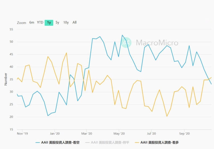 選前投資人樂觀預期美國大規模紓困刺激方案可望通過,提振市場信心,美國散戶協會(AAII)十月二十二日所公布的當周美國散戶投資人情緒指數,看多比例增至三五.七五%,高於看空比例的三三.○三%,為今年三月來偏空的市場情緒首次翻多。
