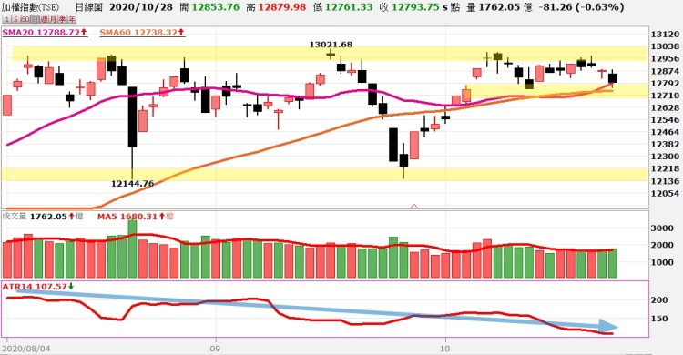 由於國際資金陷入觀望,導致加權指數的走勢持續收斂,大盤近期在季線到萬三整數關卡之間形成窄幅整理的格局。從近三個月的K線來看,台股多次向上挑戰萬三關卡,但除了七月二十八日當天爆出三千億的天量外,後面的挑戰幾乎都是無量上漲,顯示這段時間買盤不願意貿然出手挑戰高點,而是逢高獲利了結居多。隨著美國大選不斷逼近,市場觀望氣氛更加濃厚,大盤波動持續收斂。