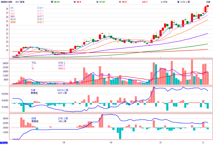 萬海(2615):受惠美國線的運價狂飆,以及低油價兩大利多。第三季合併營收為一九六.六三億元,年增六.八八%,創下歷年單季新高。公司表示第四季的消費旺季即將到來,且疫情發展仍有不確定性,為防斷鏈危機重演,廠商正加緊提前擴大存貨鋪貨,將有利第四季航運營收表現。