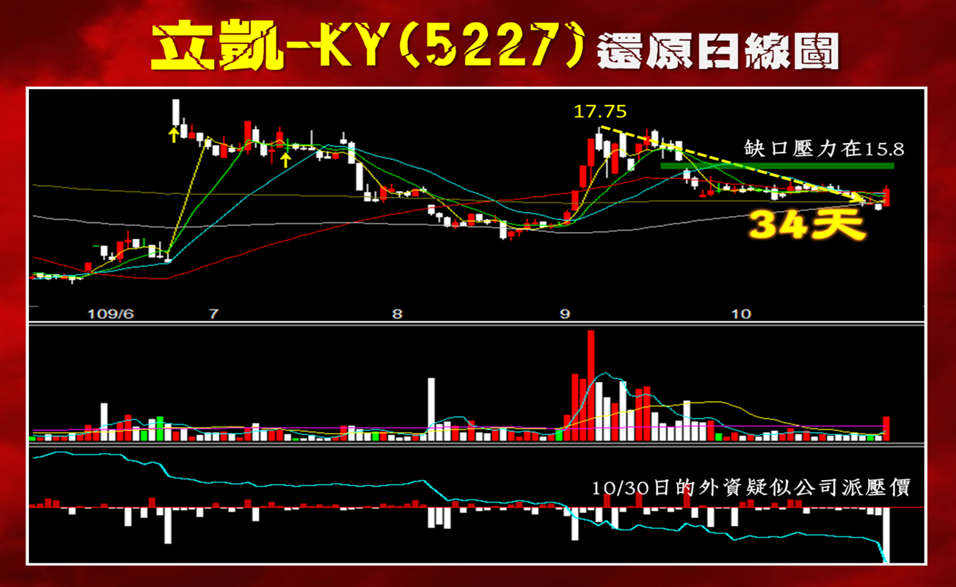 其實此股十月二十八日就是本波高點17.75元回檔的第三十四天轉折日。這三十四天整理期間一直守在現增價12.6元之上,說明還是有人在維護股價。
