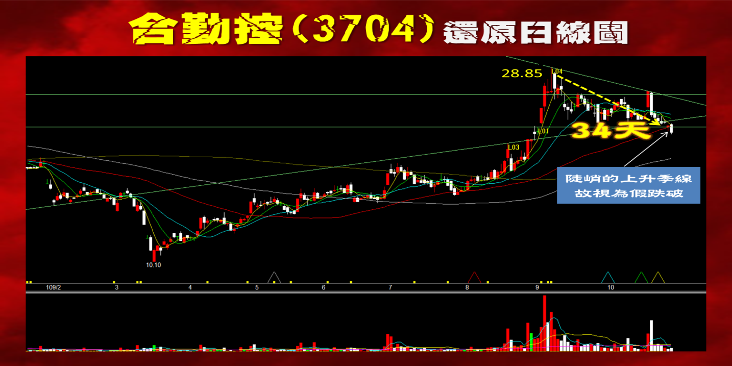 而三十四天轉折日那天收紅K,故要想直上的話,紅K不算轉折要見黑才行,於是隔日十月二十九日確實演出破半年線手法的黑K,如此才有否極泰來的機會。
