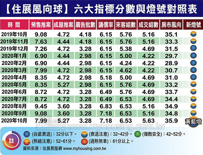 住展雜誌研發長何世昌表示,代表北台灣新建案市場概況的住展風向球,十月分數升至三五.九分,較九月份(三四.八分)增加一.一分,分數創今年來新高,對應燈號則已連續六個月亮出黃藍燈(見附表)。