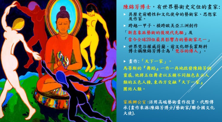 陳錦芳博士的夫人侯館長透過紐約「陳錦芳文化館」及「為人類而藝術基金會」推廣以愛為宗的全球新文藝復興。陳錦芳博士的畫作被編入全球33個國家300多本教科書、藝術書籍及雜誌;畫作廣被全球各大美術館及家族辦公室為企業代際傳承的重要收藏。