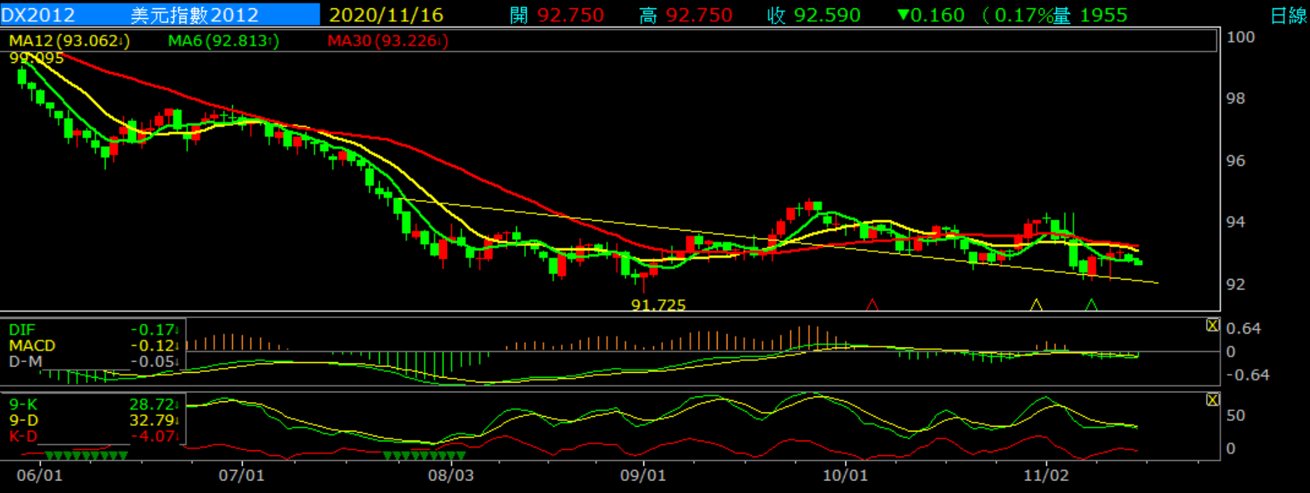 美元指數(日K)2020/11/16亞盤開盤價格走勢圖