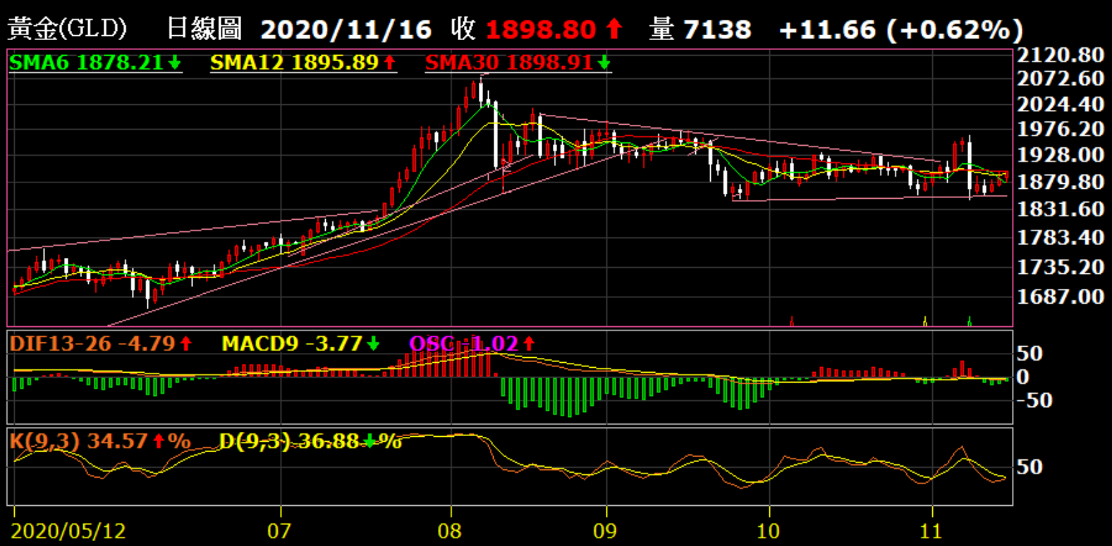 黃金(日K)2020/11/16亞盤開盤價格走勢圖