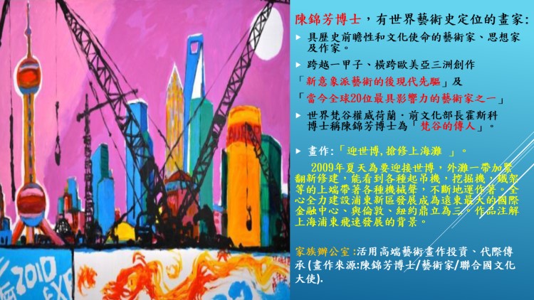筆者遂將陳錦芳博士的「上海世博」百幅畫作、「北京奧運」66幅畫作,以及新意象派的諸多著名畫作,傳遞給中華民族的讀者及您們的後代子孫。