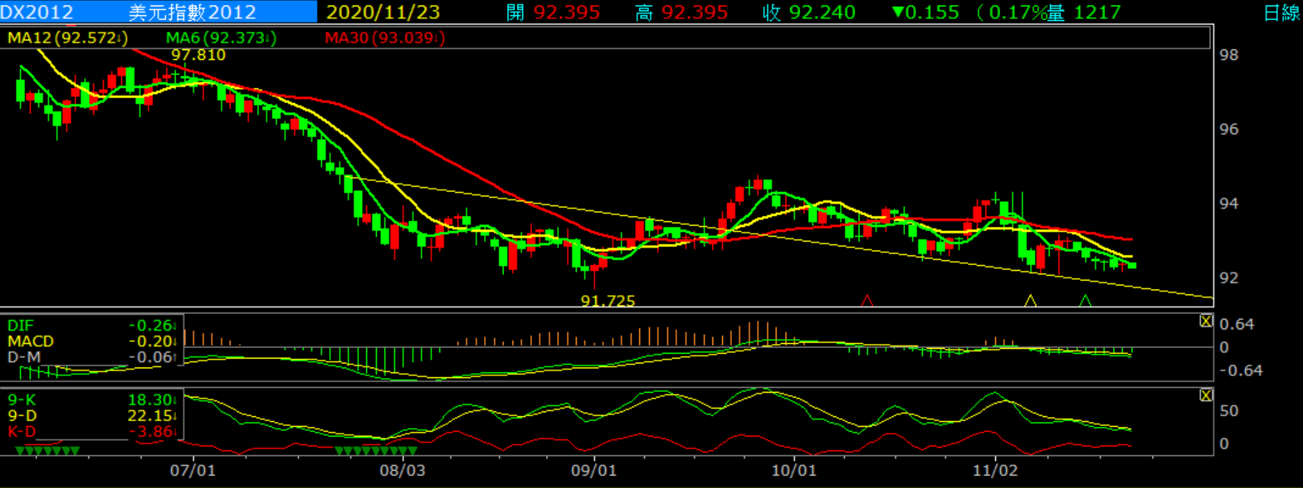 美元指數(日K)2020/11/23亞盤開盤價格走勢圖