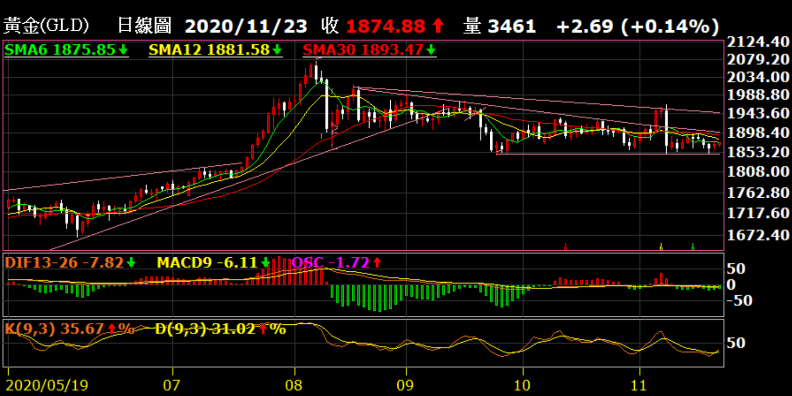 黃金(日K)2020/11/23亞盤開盤價格走勢圖