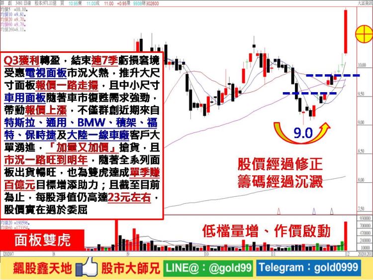 受惠面板雙虎大小通吃,隨著全系列面板出貨暢旺,為雙虎達成單季賺百億元目標增添助力,加上截至目前為止,每股淨值仍高達23元左右,雖然12/2盤中一度來到11.95元,股價仍是過於委屈。