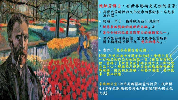 陳錦芳博士的夫人侯館長透過紐約「陳錦芳文化館」及「為人類而藝術基金會」推廣以愛為宗的全球新文藝復興。陳錦芳博士的畫作被編入全球33個國家300多本教科書、藝術書籍及雜誌;畫作廣被全球各大美術館及家族辦公室為企業代際傳承的重要收藏。