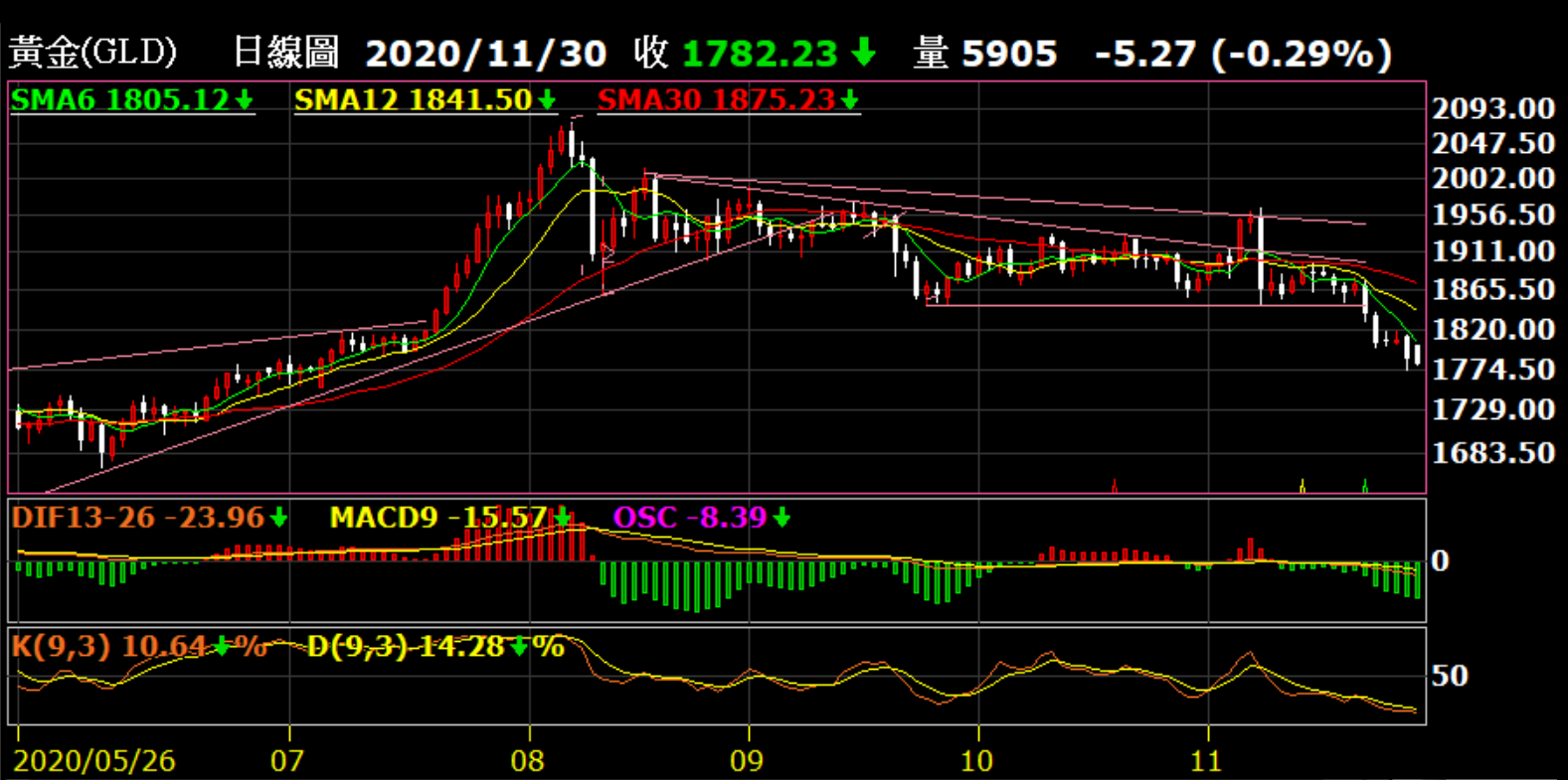 黃金(日K)2020/11/30亞盤開盤價格走勢圖