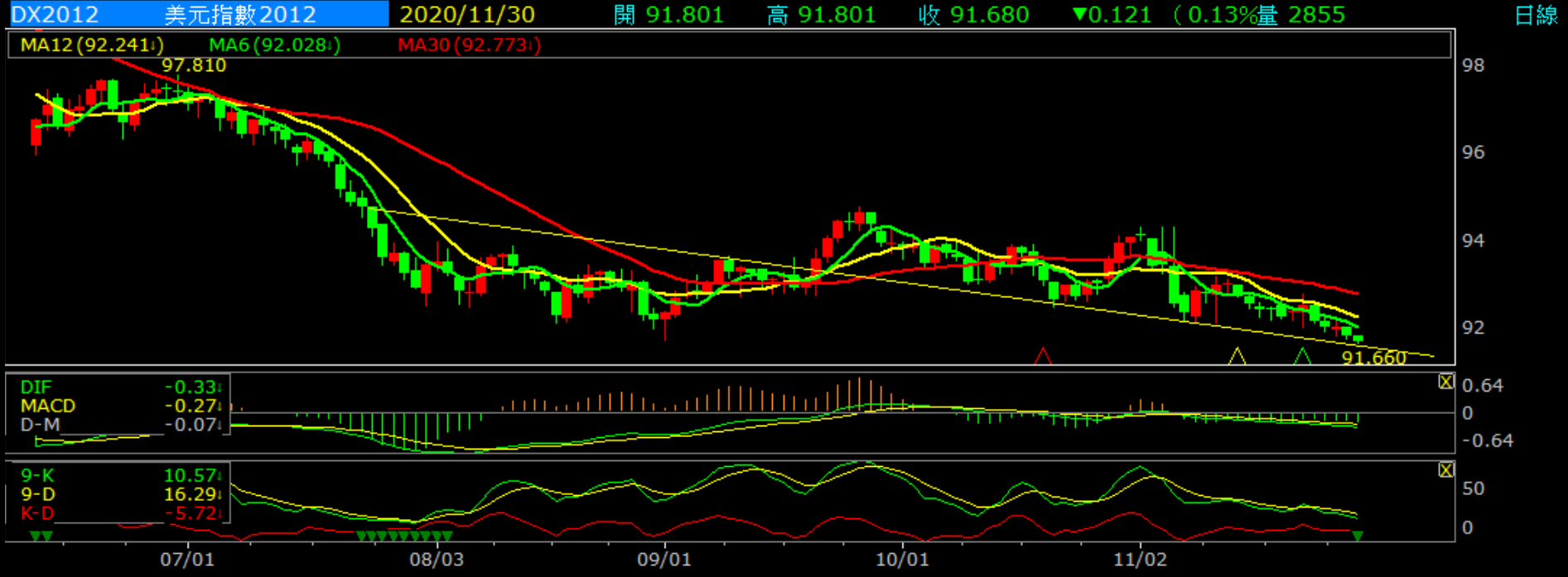 美元指數(日K)2020/11/30亞盤開盤價格走勢圖