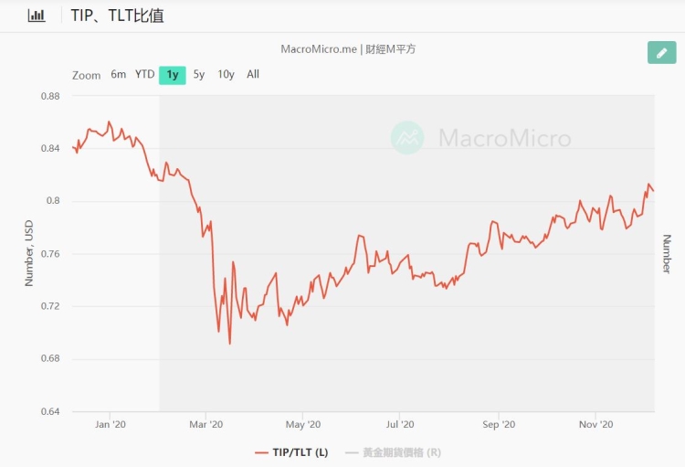 另一個被市場視為通膨率領先指標的TIP及TLT的比值,也逐步走高,回到今年美國疫情爆發前的水準,更加確定市場對通膨升溫的預期。