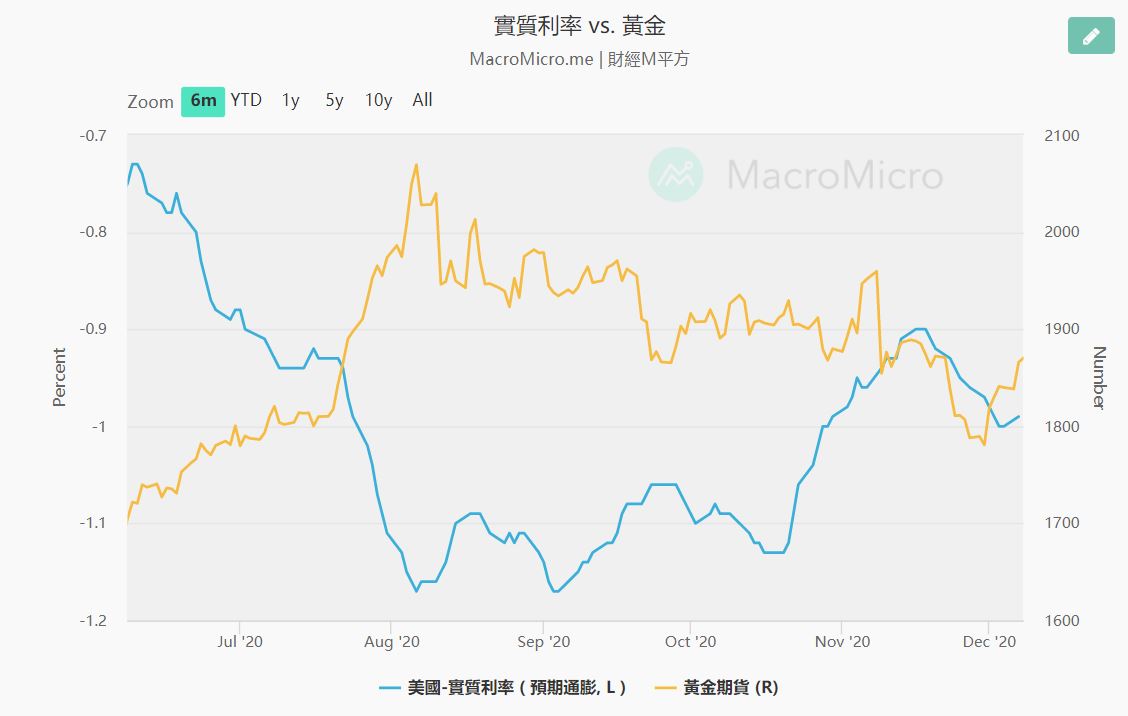 受此影響,黃金價格自十一月初高點一九七三美元,一路回檔至月底的一七六七美元,不到一個月時間修正幅度就超過一○%,完全沒有反映通膨升溫的預期,與實質利率(若預期通膨增加,實質利率會降低)的負向關係也出現脫鉤。