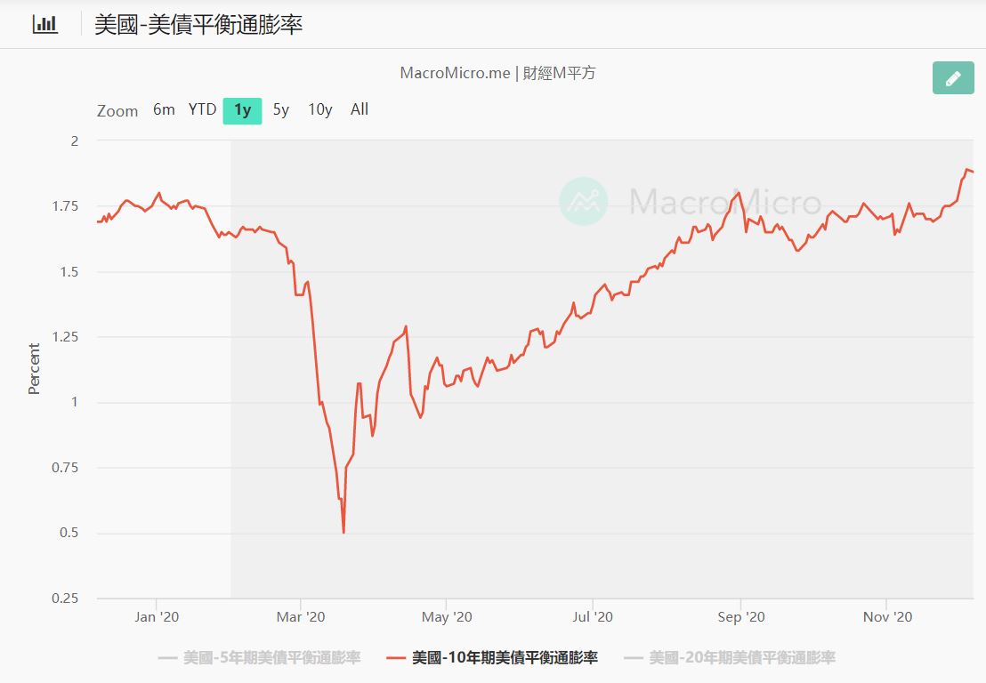 市場用來觀察通膨預期的美債平衡通膨率持續回升至一.八九%,已接近二○一九年疫情爆發的高峰水準,反映經濟重啟、財政政策刺激下,市場對未來消費回溫具有信心,進而提高通膨預期。