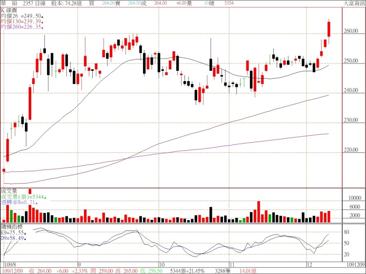 全球疫情嚴重,筆電銷售長紅,日本十月筆電銷售華碩銷量暴增1.7倍,成為日本銷售第五名,市佔率17%,目前電腦零組件吃緊,供應缺口高達三成以上,導致需求將遞延到明年第一季。近期華碩股價已經突破連續三個月箱型整理平台壓力260元,新的多頭將會開始發動。