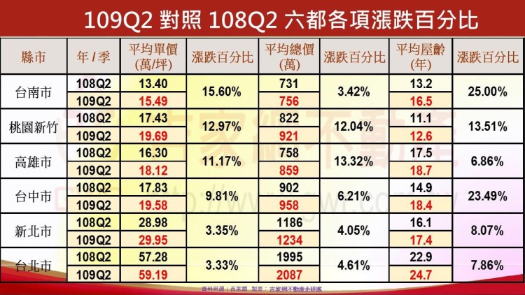 2020年上半年全台房市六都成屋房價年漲幅分別是台北市+3.33%、新北市+3.35%、桃竹+12.97%、台中+9.81、台南+15.6%、高雄+11.17%,平均總價也同步拉升,台北市已高達每戶2087萬元的高均價水平。
