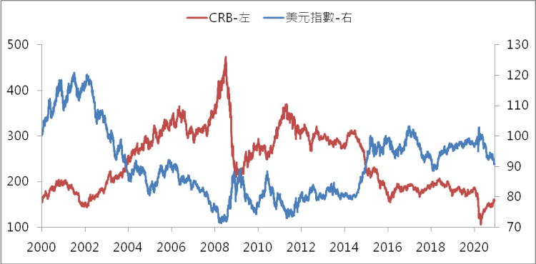 就過去經驗而言,寬鬆環境往往伴隨著弱勢的美元,而大宗物資又多以美元計價,故原物料走勢和美元常常呈現反向關係,亦即弱勢的美元將創造原物料上漲空間。