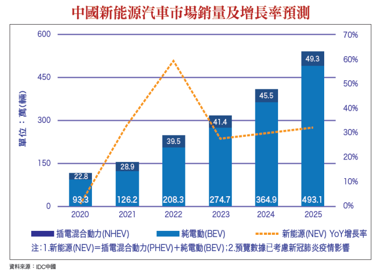 IDC預估,二○二一~二○二二年得益於疫情後的反彈,以及財政補貼期限的延長,新能源汽車銷量將大幅增長,二○二三年以後,隨著政府的財政補貼減少,整體市場將逐漸回歸穩定成長態勢,新能源汽車銷量將於二○二五年達五四二萬輛左右。