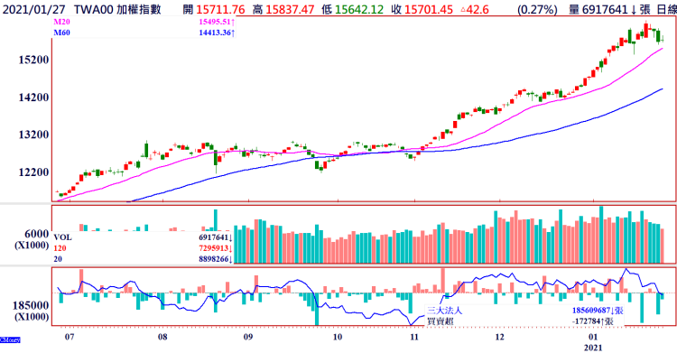 領先市場在去(二○二○)年十一月二日12481點大盤這波起漲時領先市場告知,指數區間整理近尾聲,將往上突破波段大漲上去,而且是數個月的波段行情,台股果然一路漲到一月二十一日16238點。