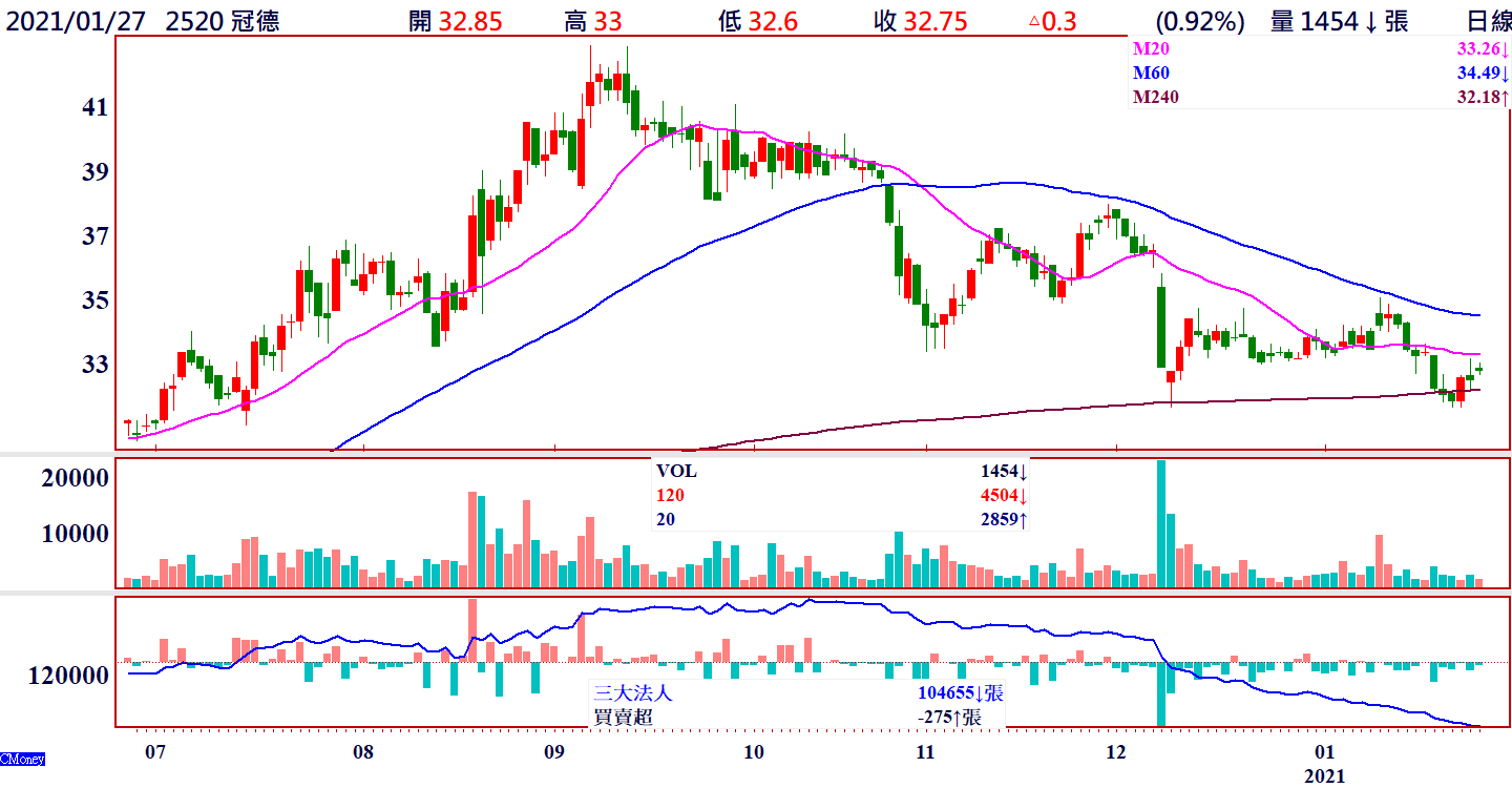 冠德(2520)去年受惠建案順利完工交屋,包括新莊的「泰極」及「泰景」兩建案,以及新店總銷八十億元大案「創新殿」也銷售達95%,已於去年底開始陸續交屋入帳,今年上半年將持續入帳。合計二○二○年合併營收達272億元,年成長77%,前三季營收137億元,累計EPS為2.42元。