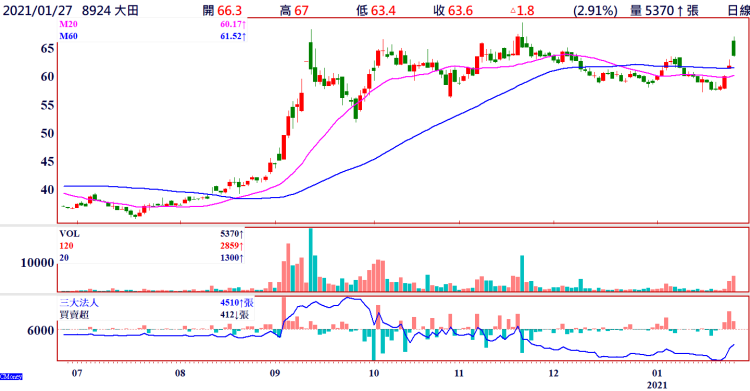 大田從去年九月開始連續五個月期間股價都維持在69~56元箱型震盪,近日在營收創新高帶動下股價開始發動,有機會產生一波新的多頭行情。