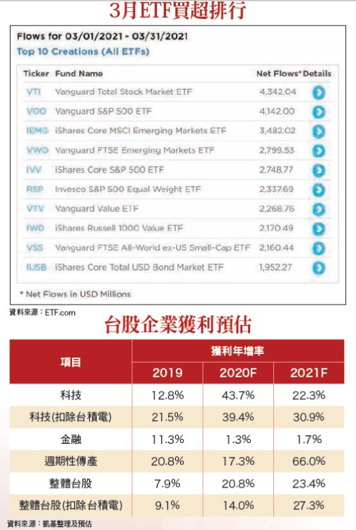 值得注意的是,台積電又剛好都是上述兩檔ETF的主要成分股,比重分別達五.八四%及六.八五%,三月合計買超台積電三.九五億美元(約台幣一一二億元),讓台積電成為資金前進新興市場ETF新趨勢下的最大受惠股。另因台積電市值佔加權指數權重達三○.六%,更加強化台股的受惠程度,也難怪台股能夠在本波美國公債殖利率飆高引發股市評價修正過程中,仍可領先其他亞股創下歷史新高。