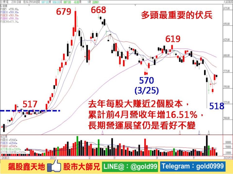 【操作建議】「低接不追高」,近期受本土疫情升溫衝擊,台積電股價一度下探至518元新低點,不過,隨著低接買盤進場、止跌契機浮現,股價很快再度止穩上漲,只要守穩前低518關卡不破,預期在內外資法人大戶買盤可望陸續歸隊的加持下,不排除後市仍將有再戰前高的機會,逢低仍值得留意(※基本面資料若有異動,依公開資訊觀測站最新訊息為主)。基於風險考量,設好停損停利(詳見附圖說明)。