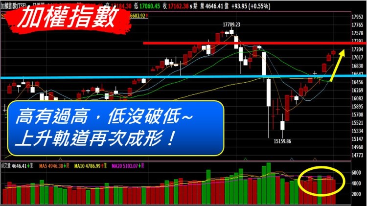 加權指數從五月十七日最恐慌的低點起漲,一路強渡關山,三分之一的反彈,三分之二的強彈都交代了,還過了五月十一日、十二日大量長黑K的高點,深V型的反彈,在站上季線後,高有過高,低沒有破低,重新形成上升軌道,反彈行情有機會變成回升行情,量價配合得宜下,行情有機會來挑戰前高!