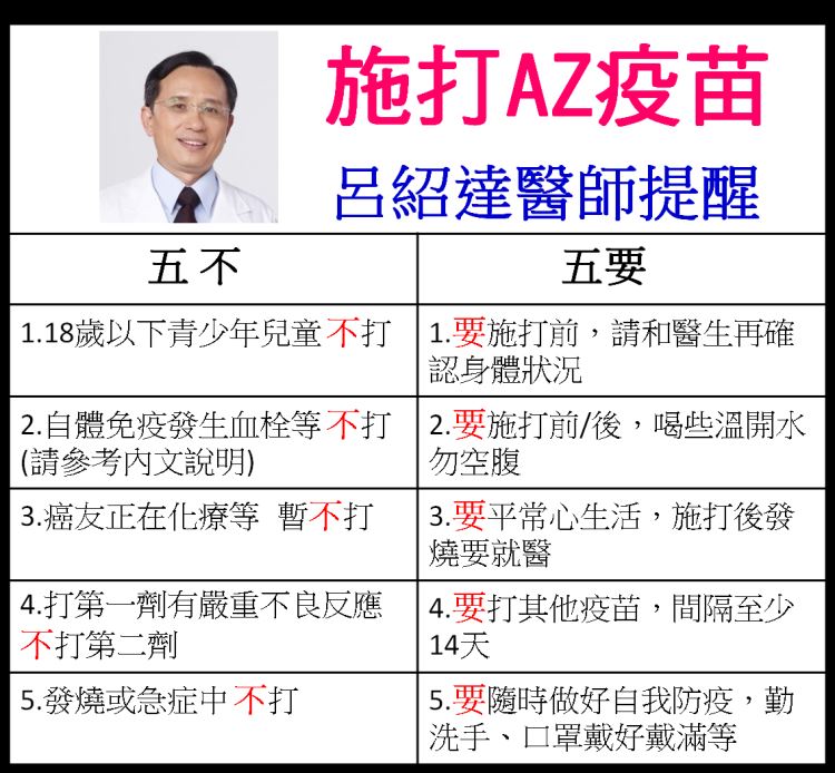 呂紹達醫師在竹東家鄉服務,病患不乏長者,最近常被問到AZ相關問題,他列出五不要注意:
