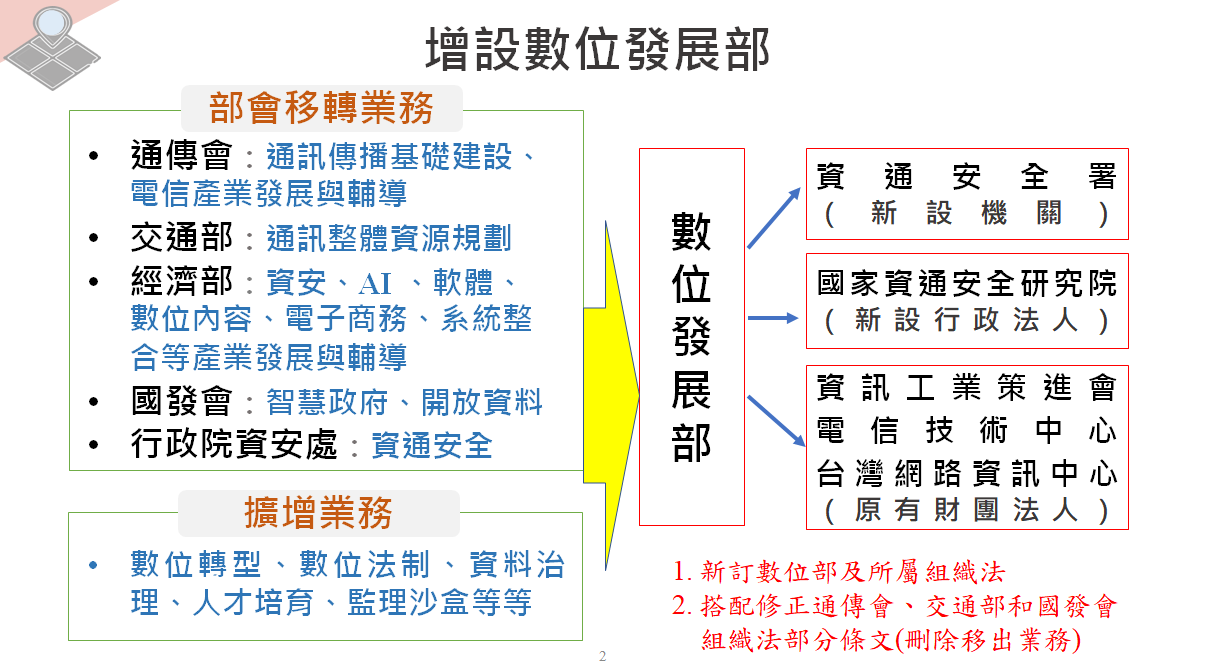 台灣將於年底或明年初設立數位發展部,數位發展部必須在數位轉型上,協助政府提供安全、效能的公共服務給民眾。然而,政府不能只能有迎頭趕上的目標,必須要將自己定位為亞太地區的數位領先國。