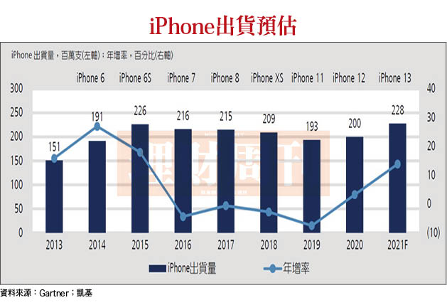 半導體下半年推進營運維持高檔的力量將來自蘋果的新品拉貨潮,相較去年iPhone 12因疫情缺料,延後一個月至十月二三日才正式上市,實際鋪貨量也低於以往,不少消費者購買需求被迫遞延,導致蘋果去年第四季iPhone的銷售額年減高達二一%。