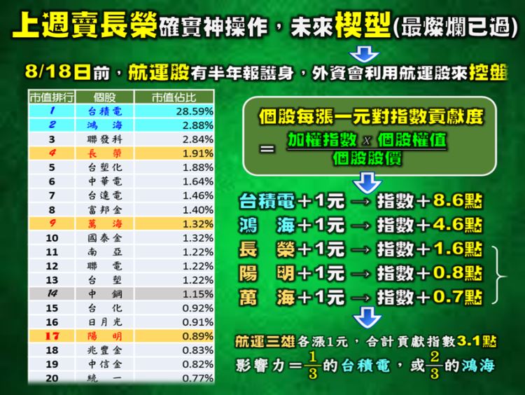 當然,航運正在風口浪尖上,我倒不認為接下來萬海公布五月獲利2.45元(月減10%)會對股價造成什麼立即變盤的影響。因為這次航運是全民參與的運動,一時半刻單單你丟我撿也可來回好幾個日升月落。同時間,航運三雄市值因為躍居二十大排名,這意謂著,外資用它們來代替台積電及鴻海,成為新一波的控盤工具(見附圖一)。