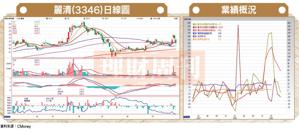 中國力推「新能源車下鄉」政策,刺激新能源車市買氣,麗清也搭上中國電動車銷量成長的順風車,成功切入大眾(Volkswagen)電動車「ID.4」的車燈供應鏈;加以今年中國車市前景看多下,法人機構樂觀預期,麗清後市營收業績將可水漲船高,全年EPS可望自原本二.五元起跳,創下近三年來新高水準。