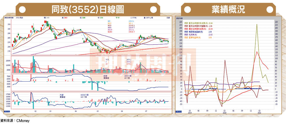 同樣入列Tesla概念股的同致,自結六月合併營收六.一七億元,月減二.六八%,寫下今年以來的單月營收次低。法人機構認為,同致中國營收占比超過八○%,中國車廠今年以來,持續飽受車用晶片供貨短缺所苦,影響對上游零組件協力廠商的拉貨力道。法人預估,於獲得Tesla訂單持續加持之下,依舊看好同致今年獲利表現。