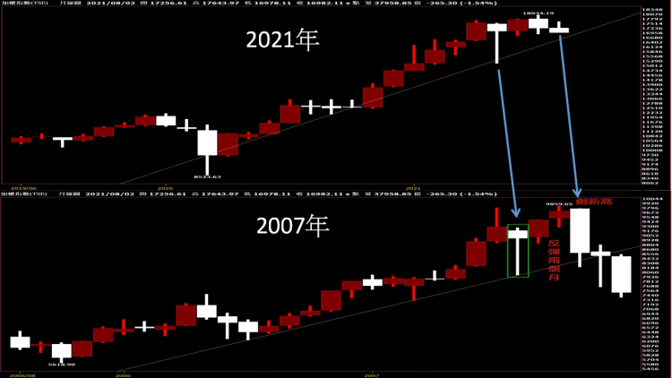 於是今年五月本土確診爆發,加權指數快速跌了2550點,走勢很類似2007年因次貸風暴橫空出世,短短一個月大跌1820點,都是措手不及的全市場套牢。但隨後展開一波創新高的逃命波反彈,例如二○○七年的9859點與今年的18034點。